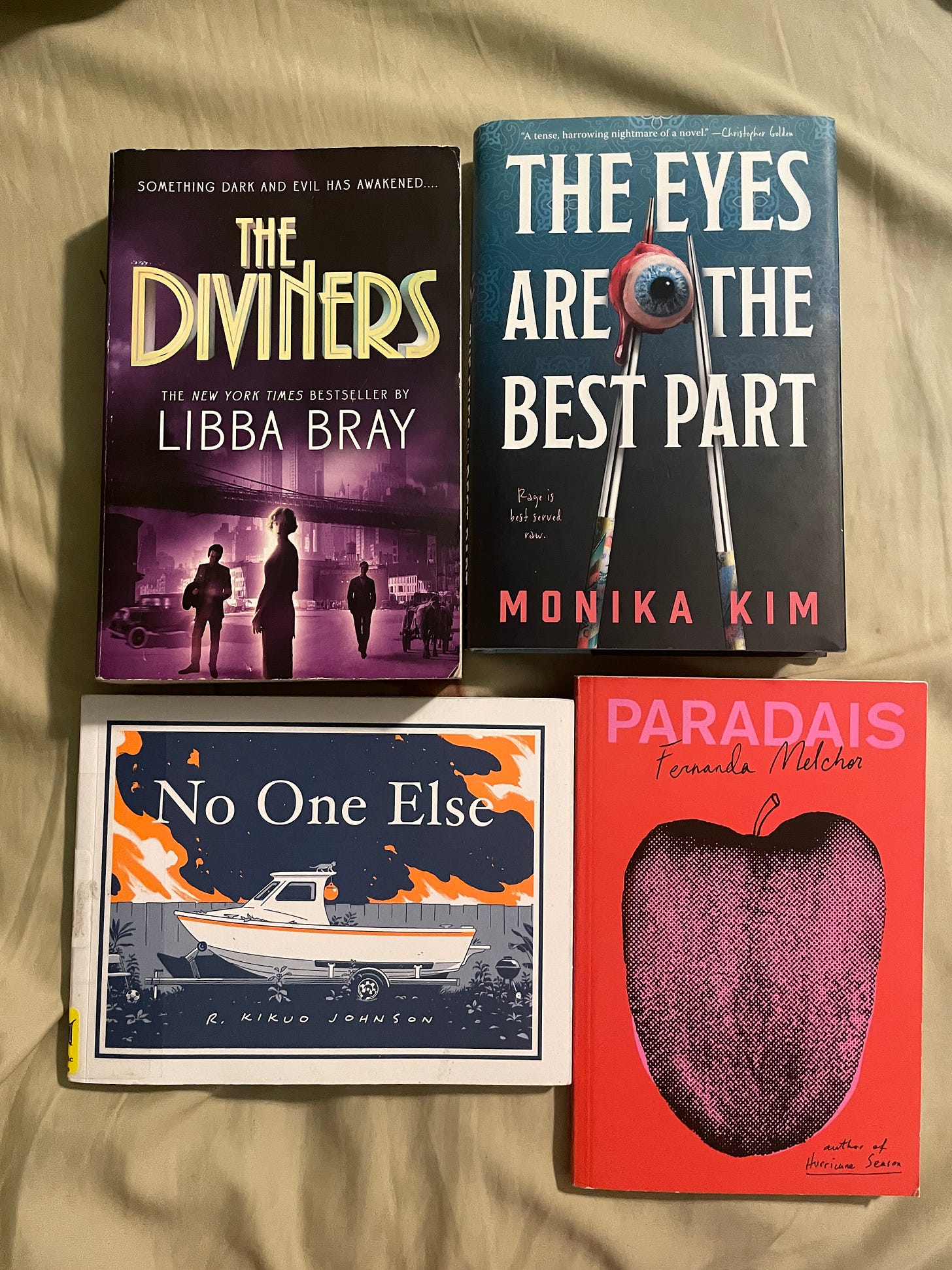 “The Eyes Are The Best Part” is a book that I bought new, which is a bit rare for me. When it was first announced I was quite excited by the premise and the juicy cover. The reality of the narrative left me a bit wanting. Despite being rather short (277 pages) the narrative felt a bit drawn out, especially in the beginning. It’s also not a subtle horror, which tends to be more my favorite types in the genre. I also felt that the ending was just too neat and tidy. There were several characters and plotlines just ignored after they were introduced, which could have been indicative of the narrator’s mental state, but I feel were just more the flaws of a debut novel. There are some interesting aspects to this story, primarily mother/daughter relationships and mothers choosing romantic love over their children. I will look at future work from Kim, but I wasn’t left as wowed by the debut that I wanted to be.
